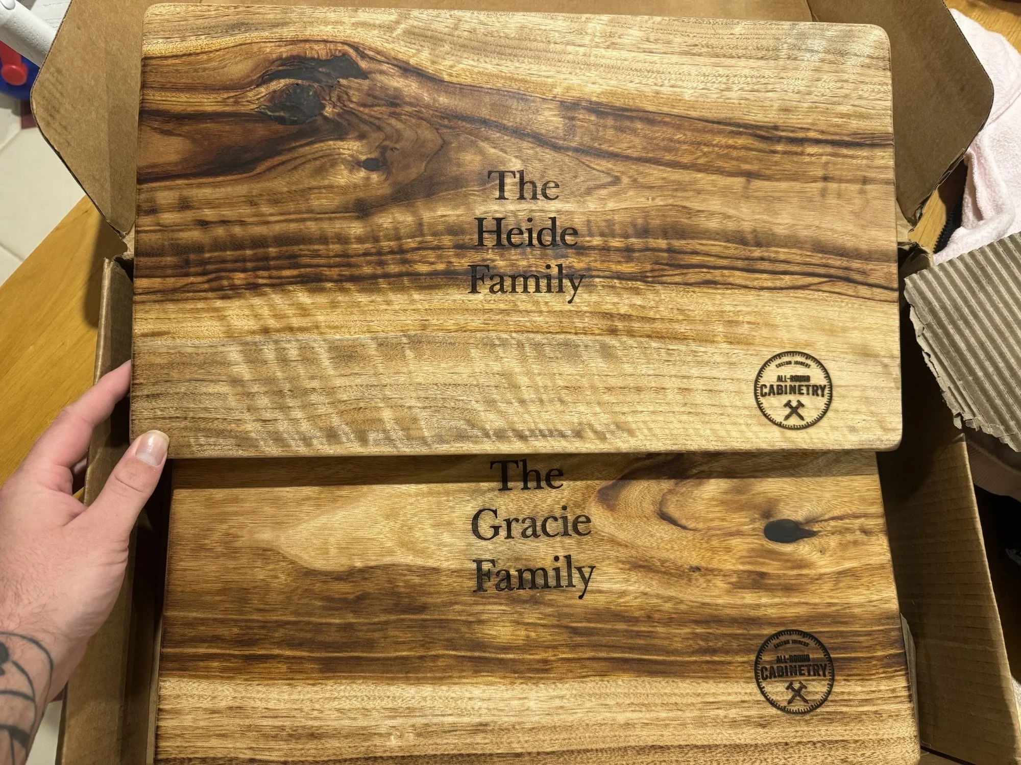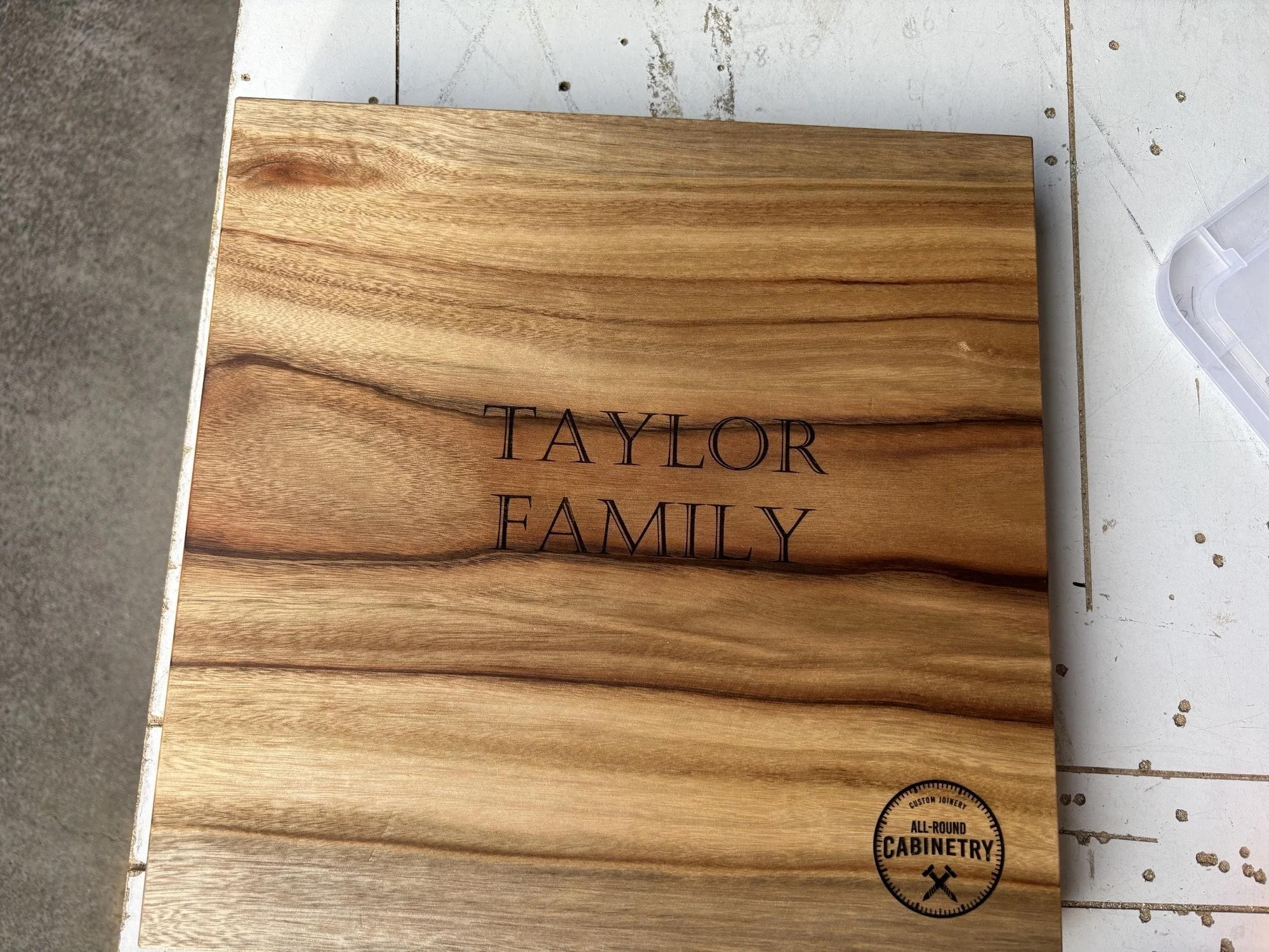 Finish: Custom engraved to your specification and treated with Gilly’s food grade natural oil.